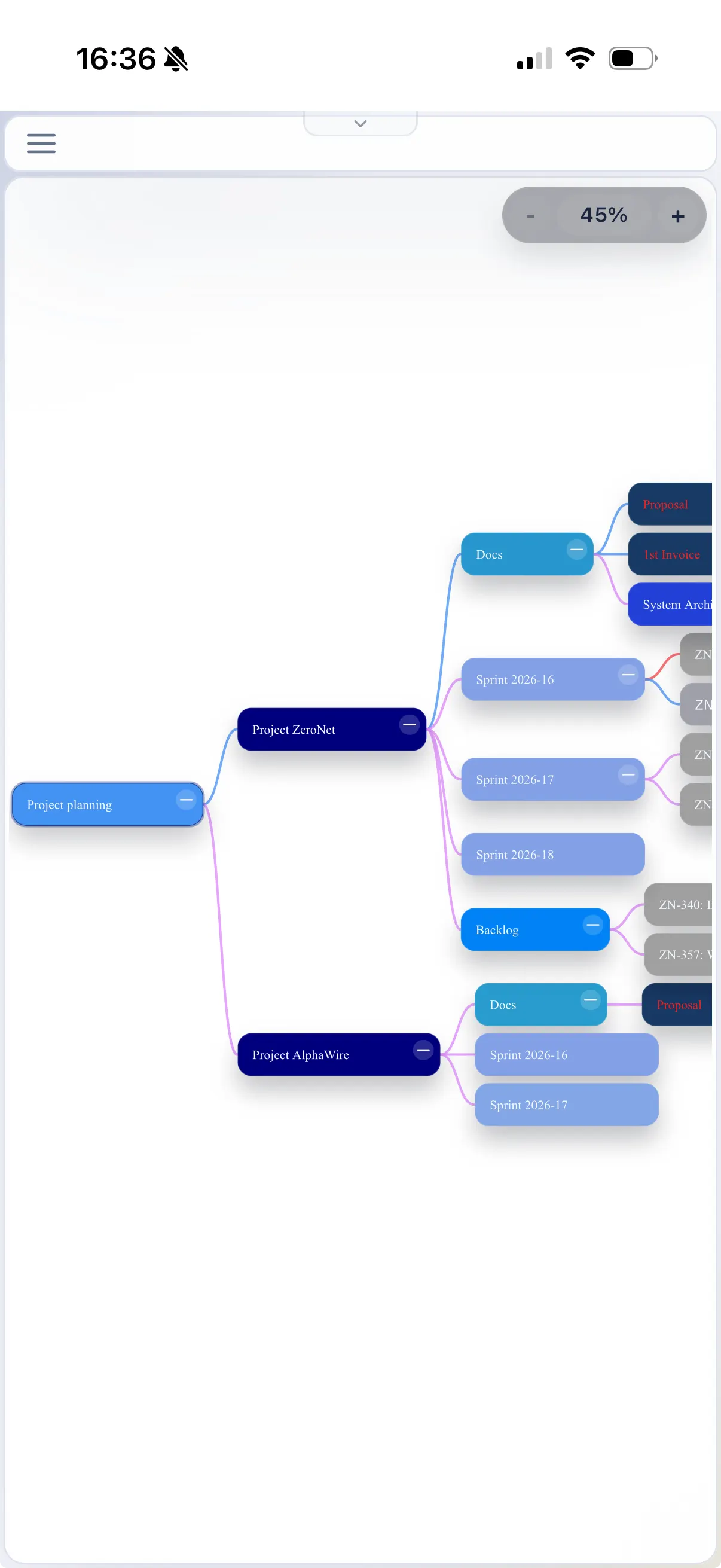Mindoo Vega turns encrypted project data into a spatial mind map with nested projects, sprints, documents, and tasks.